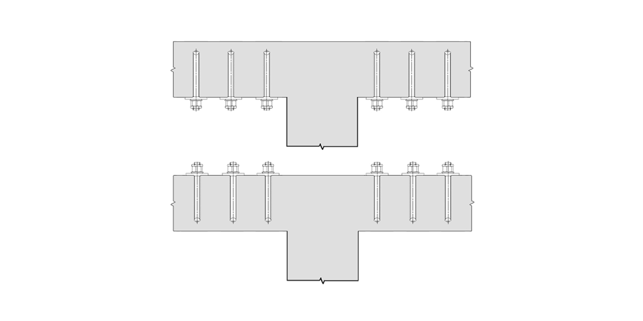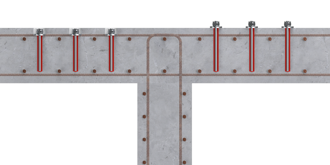 - Vergrösserung der Auflagerflächen durch die Kombination aus HCC-Serie (HCC-K, HCC-B, HCC-HUS4, HCC-U) und nachträglich installierten Bewehrungsstäben.